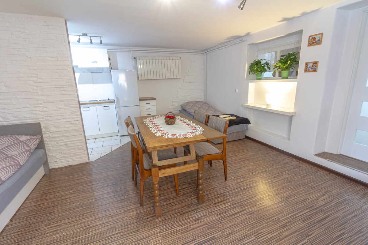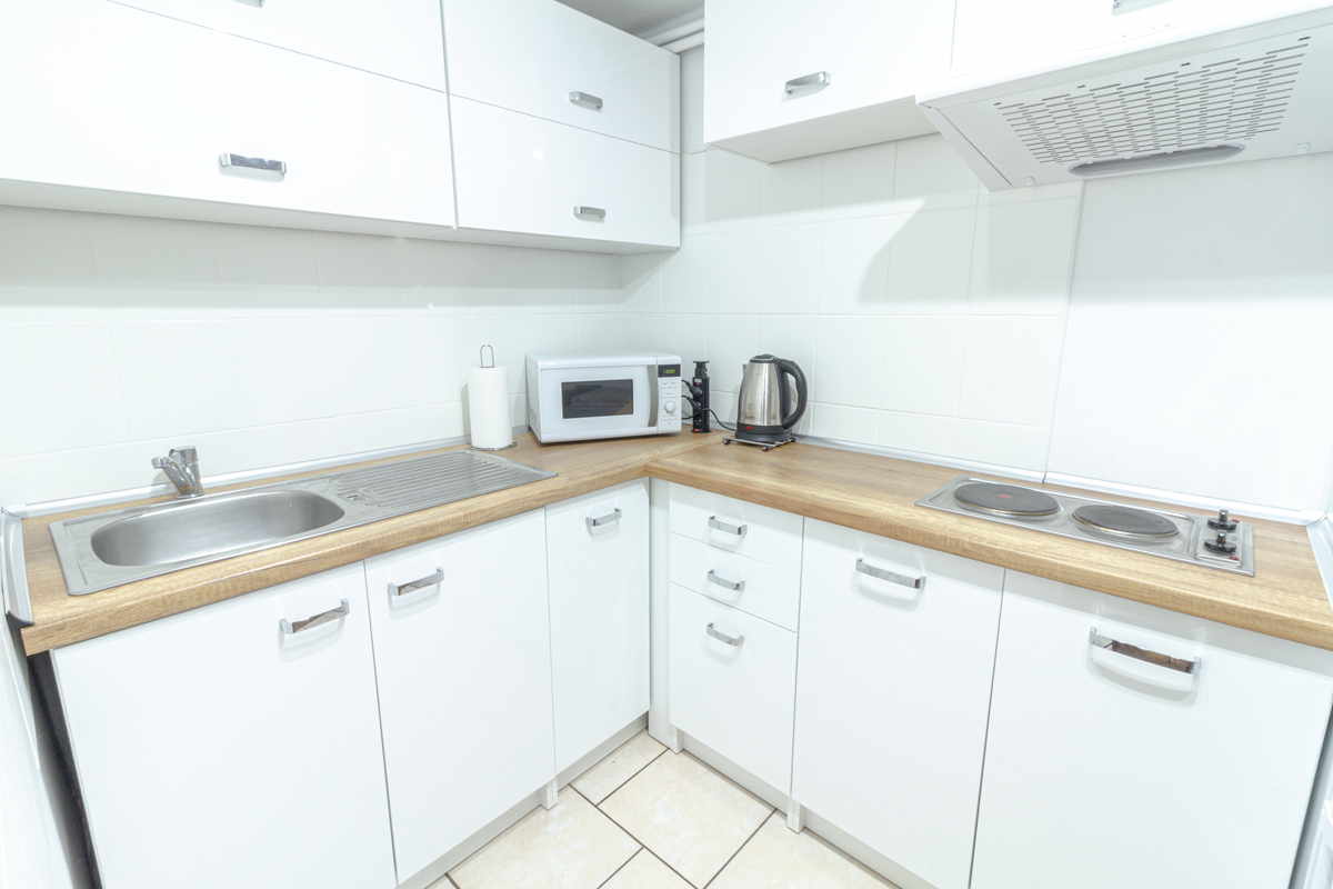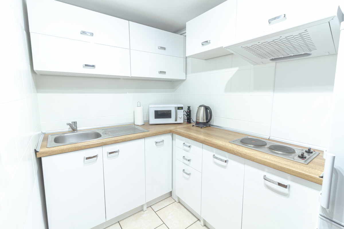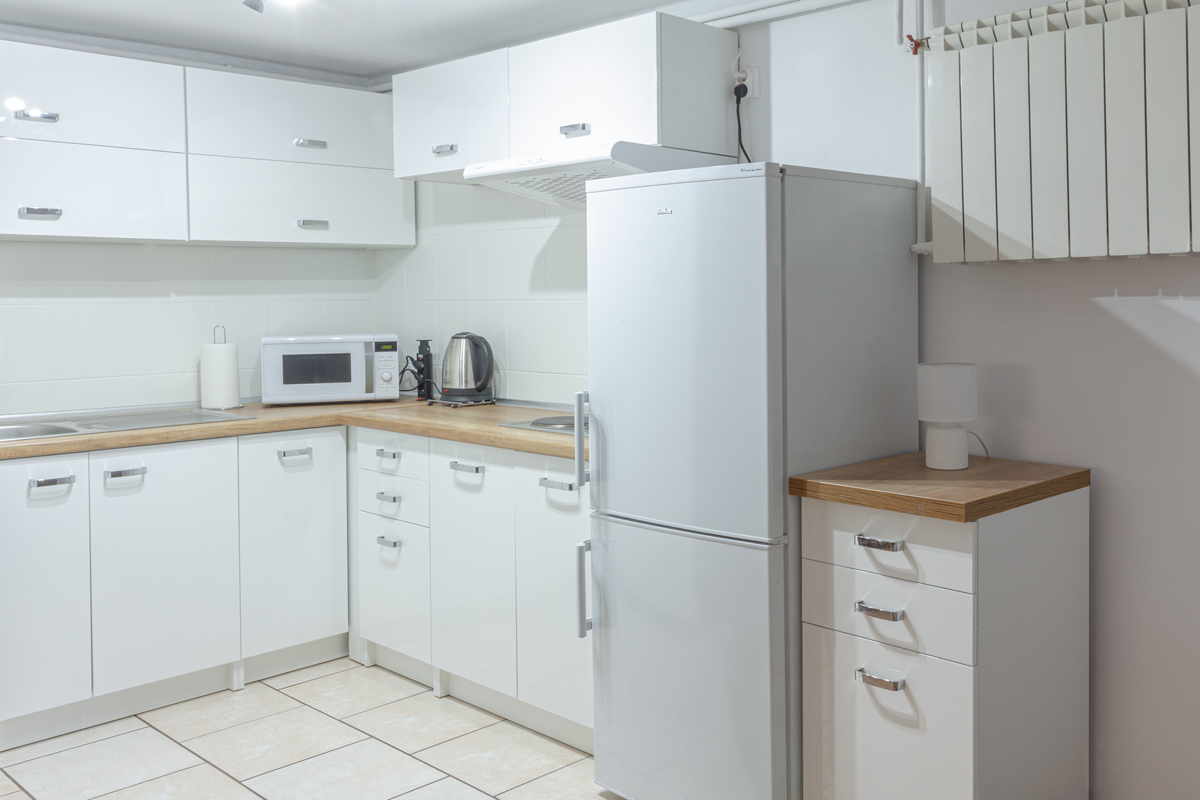 Aneks kuchenny znajduje się w pokoju głównym. Na wyposażeniu znajdziemy m.in. dużą lodówkę, kuchenkę elektryczną i mikrofalową oraz czajnik bezprzedowy. Aneks kuchenny jest w pełni dostosowany do przygotowywania posiłków.