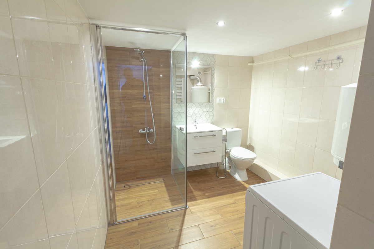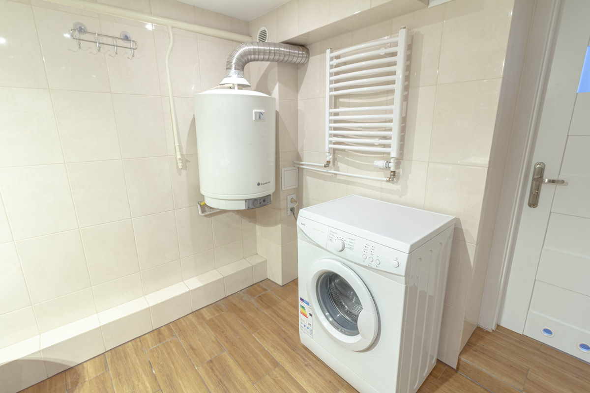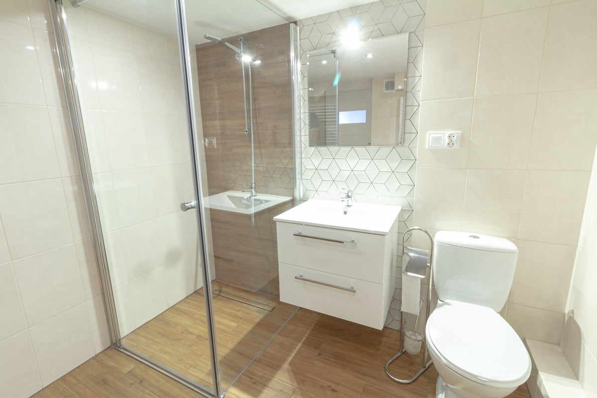 W łazience dostępna jest przestronna kabina prysznicowa i pralka automatyczna. Powierzchnia: 5,5 m2