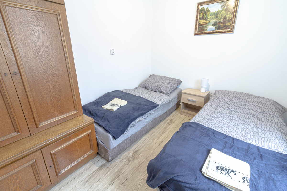 W pokoju znajdują się 2 pojedyncze łózka i duża szafa. Wejście do pokoju bezpośrednio z wiatrołapu. Powierzchnia: 8,5 m2
